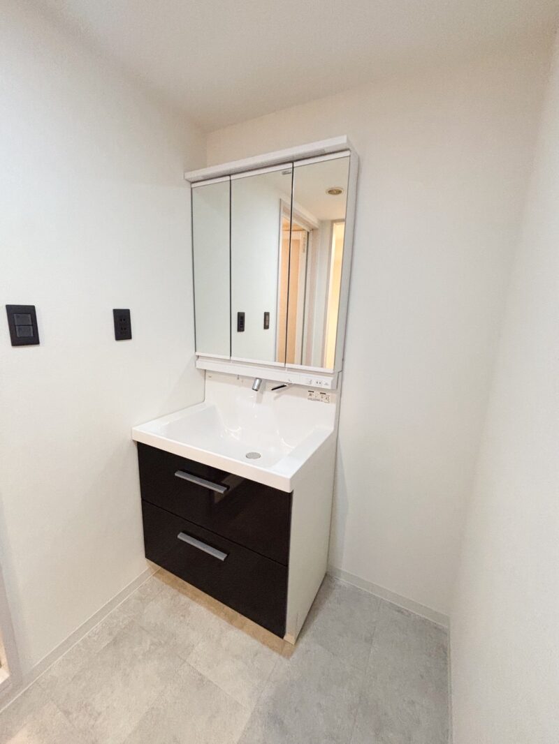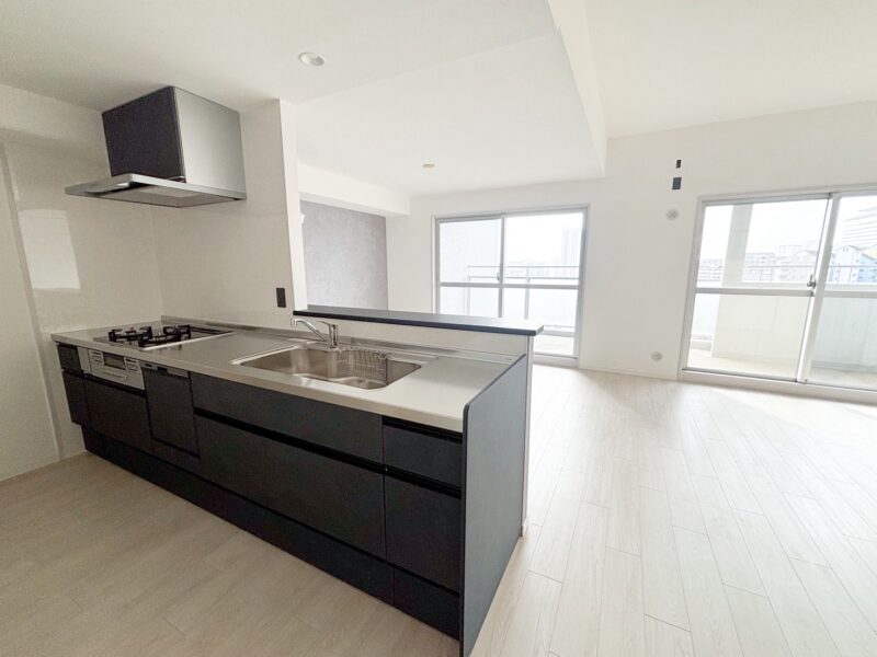 黒っぽい色、食洗器付き。三ツ口コンロ、収納もゆったり・・
