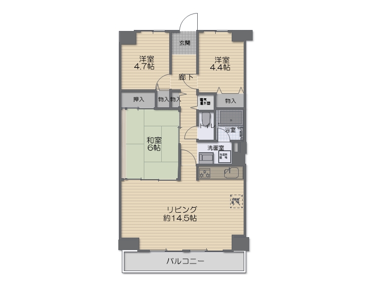 何人暮らしで住むかによりますが、ここでは小さいお子さんがいる3人家族だとして、洋室はお父さん、お母さんそれぞれの部屋。