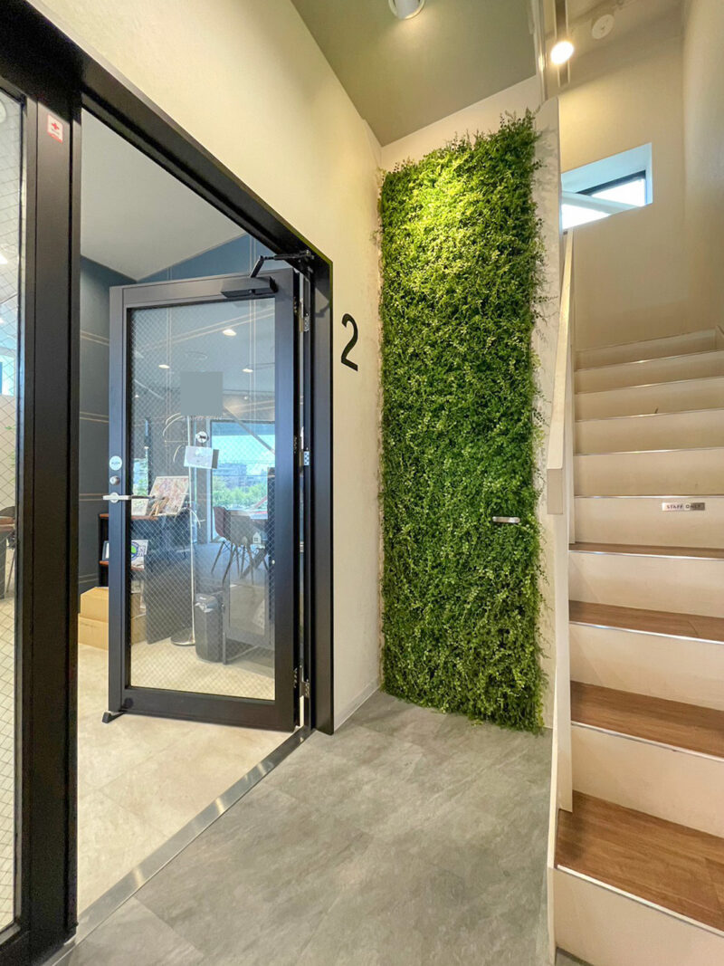 1階から階段をずんずん上がると先ほどの部屋に到達するんですが、この緑のもさもさの先にはトイレが隠れてたりします・・!