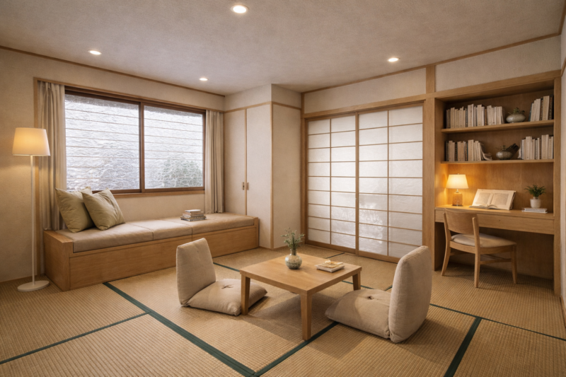 この和室をAIに頼んでリフォームしてもらったらこんな感じ。